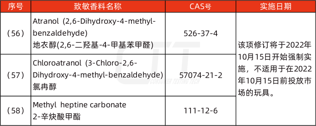 1) 法規(guī)附件23部分第11點(diǎn)的第一個(gè)表格中增加了3項(xiàng)禁用致敏香料,如下:
